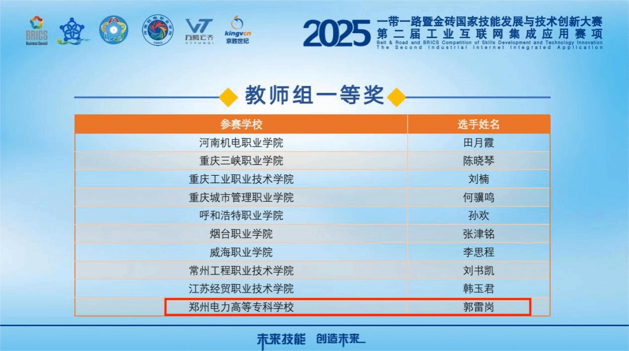 近日,2025一带一路暨金砖国家技能发展与技术创新大赛“工业互联网集成应用赛项”全国总决赛圆满落幕。经过多轮严苛选拔与高强度集训,yl7703永利郭雷岗老师荣获教师组一等奖;物联网2481班赵乐天获得高职组一等奖;物联网2302班张希琳同学获得高职组三等奖;李晓洁老师获评优秀指导教师;公司获得“最佳组织奖”。郭...